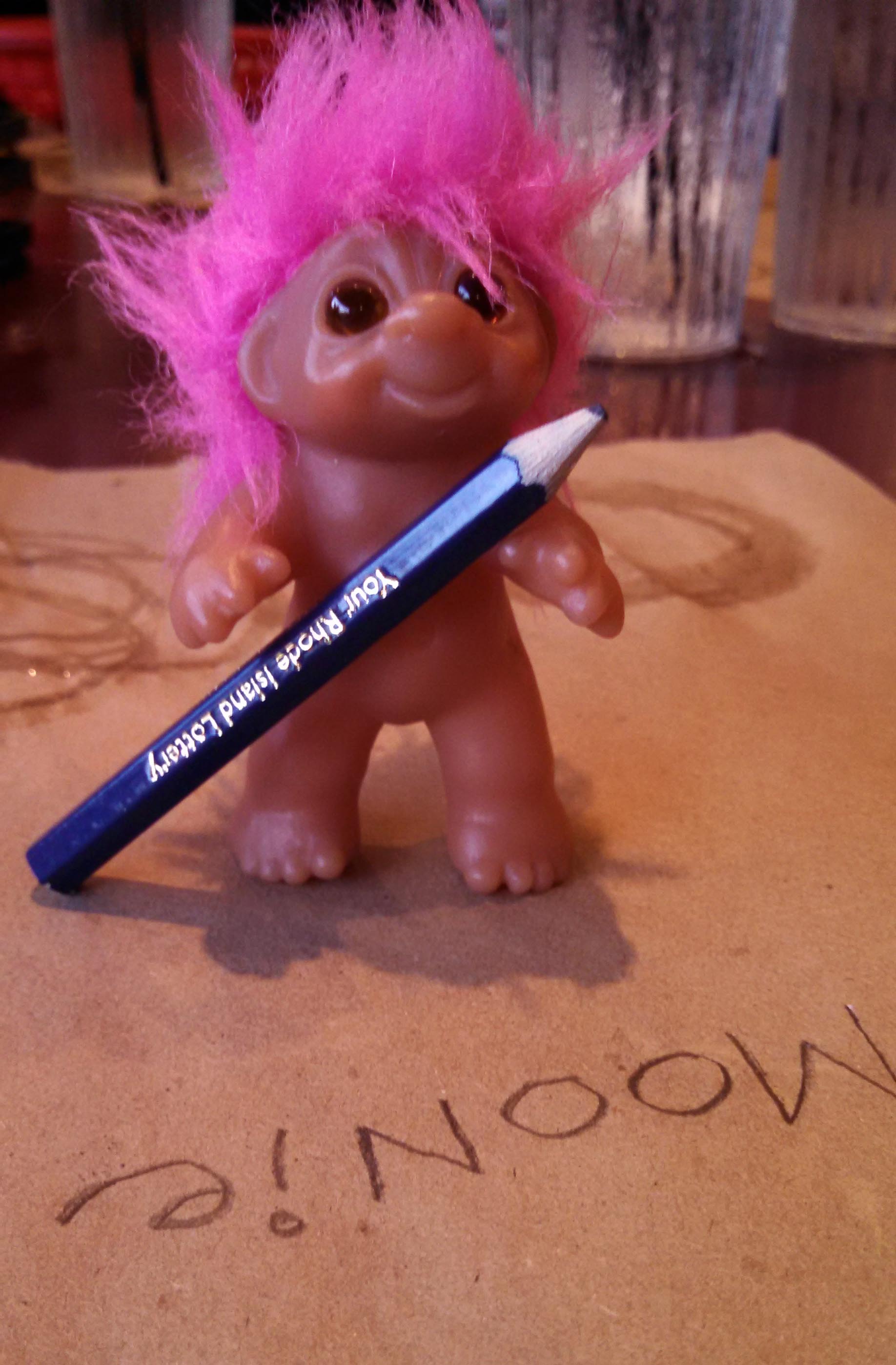 The only thing that worked – on top of buying him a cookie – was giving him his very own Moonie-sized pencil to draw on the paper placemats. He is still perfecting his name. He’s doing a pretty good job lately.