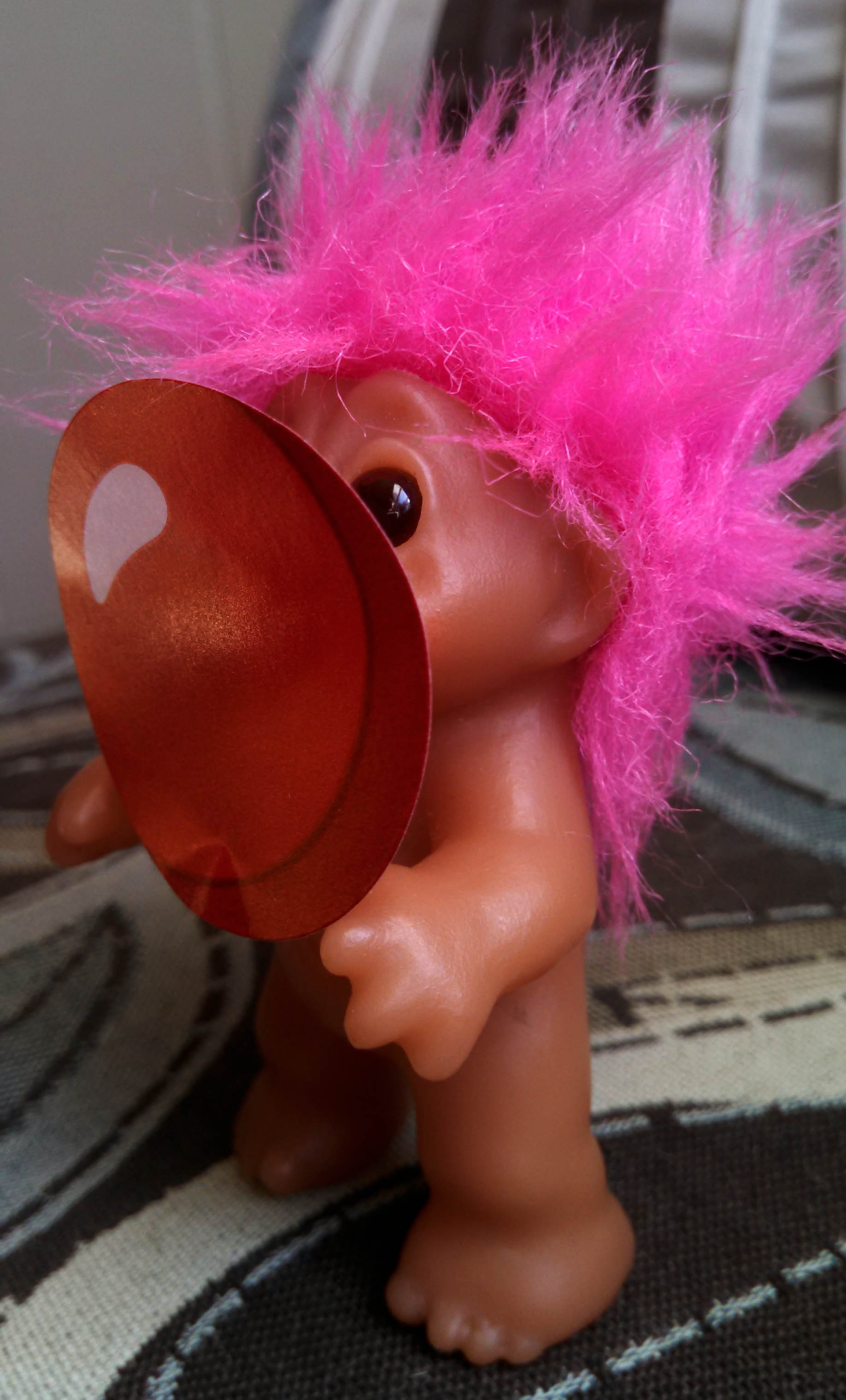 I hadn’t heard of Red Nose Day, which is apparently an annual fundraiser where comics use entertainment to raise money for those in poverty. It sounded like a decent cause, so Moonie and I kicked in a bit to the campaign at a local pharmacy, whose cashier sported a red felt mustache and red bow tie, and she gave him this swell red nose sticker to wear for Red Nose Day. Oh BOY! He can’t wait to put it on!