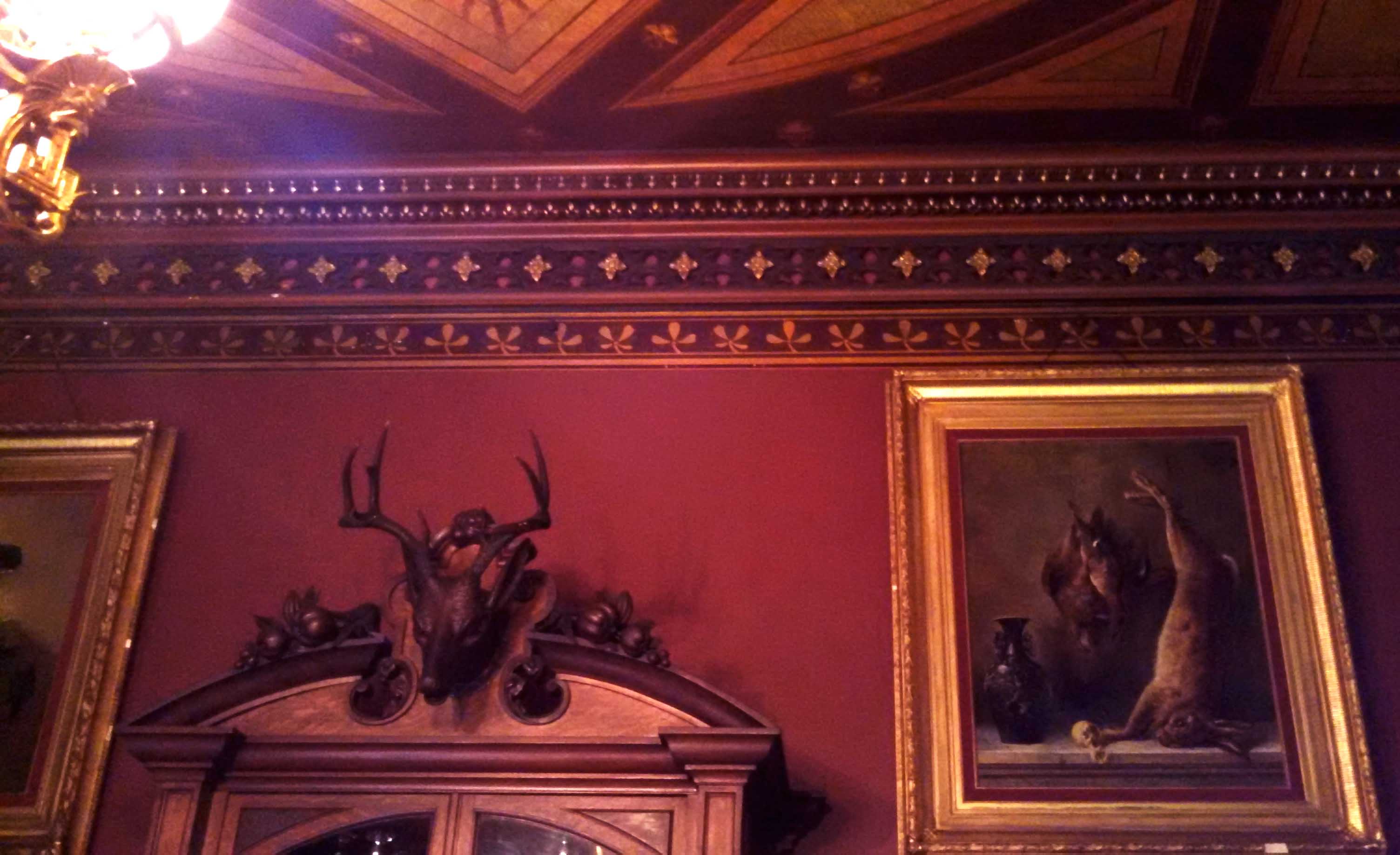 The dining room, per Victorian style, was masculine, with overt hunting themes in the carved wood details and paintings – even etched into the glass on the doors.