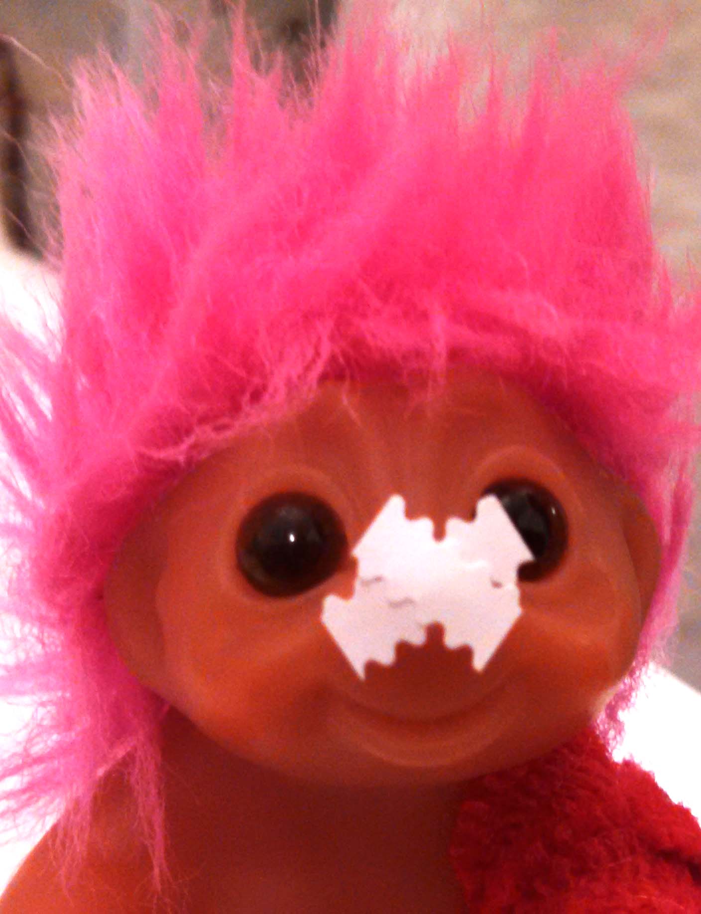 When we finally got home, armed with the news that yes, it appears broken, but no, there’s nothing they can do unless the swelling doesn’t go down in a few days, in which case an ENT specialist will need to – shudder – reset it, I wasn’t feeling really great. My face won’t stop hurting and throbbing, and I’m a bit self-conscious about how my swollen nose looks, too. So Moonie cheered me up by sympathy-bandaging his own nose.