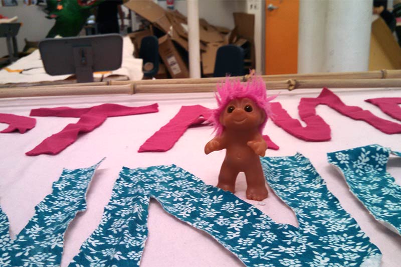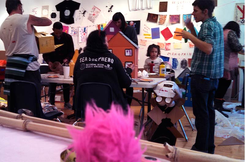 New Urban Arts is an awesome program in Providence where artists mentor city youth, encouraging them as emerging artists in a safe spot and even helping with homework. But today NUA was a hive of mostly grown-ups as hordes of volunteers, activists, individuals and families attended NUA’s open studios for Pronk! preparations. Those crowds included, of course, our own Moonie.