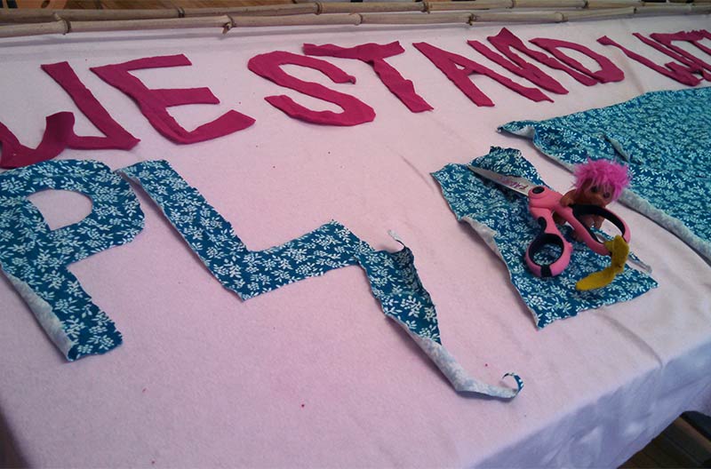 But Moonie got a big responsibility from Beth: make a BIG banner (pink! His favorite color!) that would read, “WE STAND WITH PLANNED PARENTHOOD.” He looked admiringly at the pale pink background and jumped right into cutting out the letters in colors that would pop. (He thought his backwards “N” gave it a good “homemade” look.) And he got to work with Vida, the pretty lady he’d met before at Fort Foreclosure. Vida helped Moonie figure out how the banner would withstand the wind, collecting bamboo beams that would support it when carried in the parade on Monday.