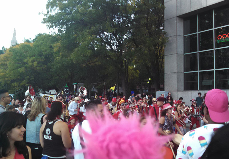 During the march, Jeremiah and I were trying to clear South Water Street of spectators, so I kept holding my arms out to push the crowd back so they wouldn’t have their toes stepped on or get in the way of the bands and dancers that were coming up behind us. It’s a testament to the spirit of PRONK that the people I was trying to shove back kept grinning and running up to high-five me.
