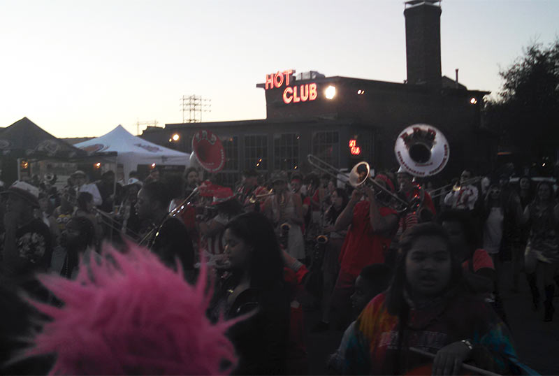 At any rate, we all made it to the end of the road at the Hot Club, where different bands immediately fanned out to play for the huge crowds of attendees.