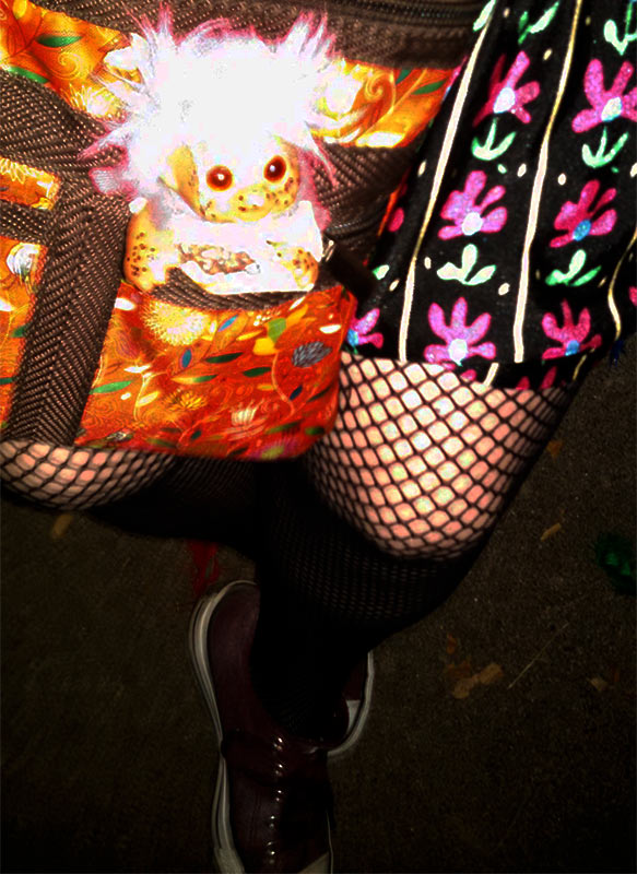 Or maybe it’s hard to be intimidating as a traffic director when a glitter-faced, pink-haired troll hanging around your neck is waving at everyone and calling out “Hi! Happy PRONK! Whee!” from his little pocket of your bag.