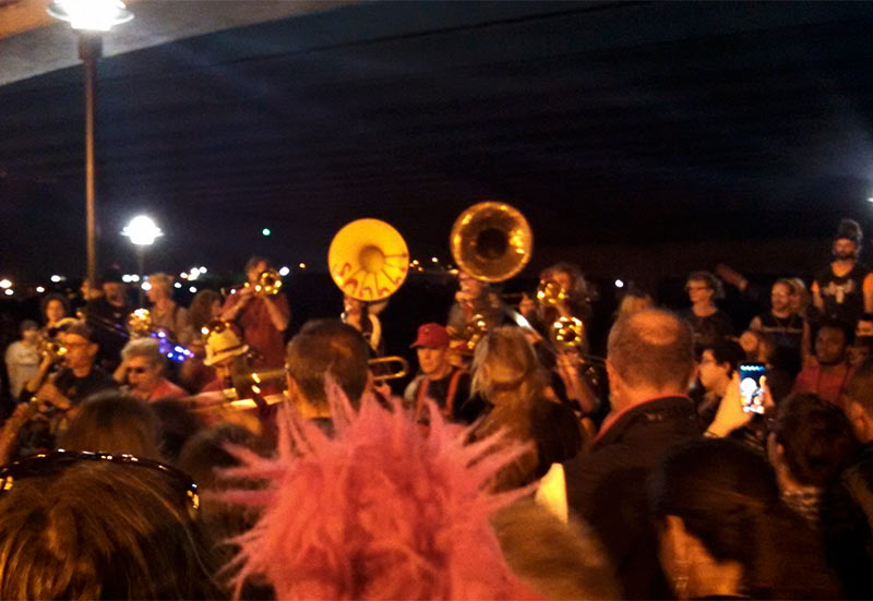 And here’s – sniff! – the last photo I ever took of my nude little dude. He was enjoying Second Line Social Aid and Pleasure Society at the hurricane barrier, whooping it up, dancing in his little pocket and looking forward to his hometown bands Extraordinary Rendition Band and What Cheer? Brigade.