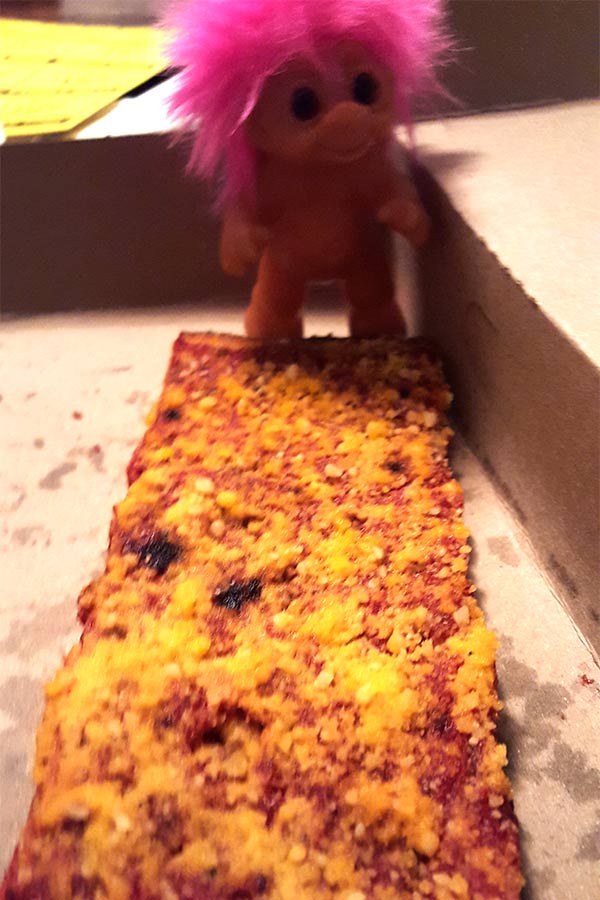 Along with the slice of pizza, Tomato City provided a slice of “party pizza.” I never heard of this before moving to Rhode Island and it’s kind of odd – a square or rectangle of pizza crust and sauce and sometimes, but not always, cheese, and it’s served cold. Moonie has adjusted to Rhode Island food. I think he could adjust to anything.