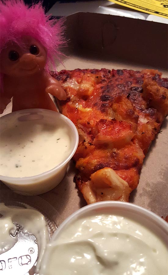So he had plenty of dipping sauces for his slice.