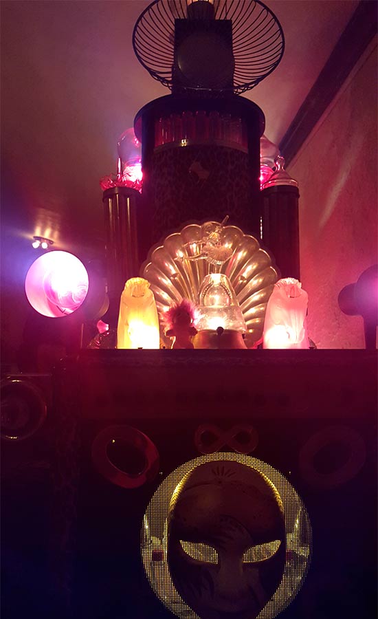 There is always some kind of artwork on the second of the Columbus’ three levels. Moonie found this sculpture that was part train, part animal-hide-upholstered bench.