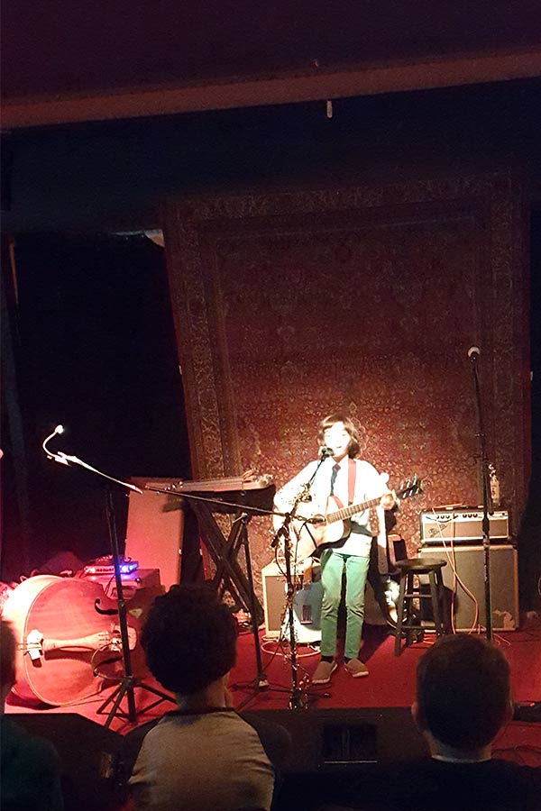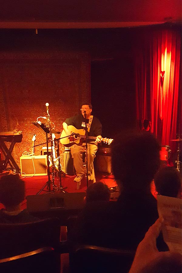 Ian was followed by Erik Narwhal, who walked onto the stage dressed as Elvis Presley and had the audience hooting over his funny and enthusiastic renditions of “It’s Now or Never” and “Burning Love” while he tickled the ivories, and by Alex Agronick covering Costello’s well-known “Suspicious Minds.” Moonie was in charge of taking photos of Erik and Alex, as I was off digging out my guitar to follow them with a little performance, but Moonie was enjoying the show too much to snap pics. Ah well! At least he had fun.