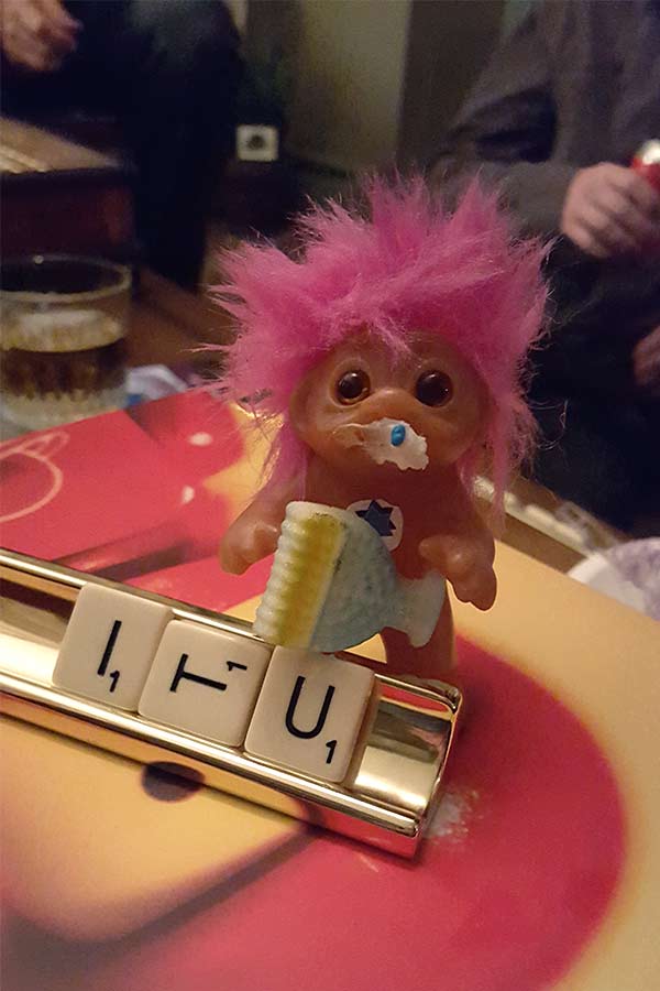 Moonie’s cool friend Renee threw a Scrabblekah party – billed as “the ninth annual mashup of everyone’s favorite word game and the Jewish holiday of fried goodness” – last night. Those things sounded great to Moonie! He got into the pre-party spirit by pulling out his little dreidel and singing every verse of the dreidel song.