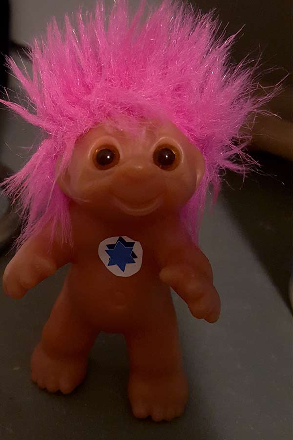We were each handed Hanukkah-themed stickers to wear, from “I love you a latke” to “Beautiful festival of lights.” The stickers were too big for Moonie, so Moonie’s friend Don worked really, really hard to cut out a little Star of David sticker for Moonie to sport. He was thrilled with his little star sticker!