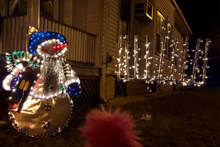 Moonie looked a little nervous when we parked in front of Renee’s next-door neighbor’s house, which sported a front lawn full of, among other characters, no less than three lit Santas. (“How do we know which one is the real Santa?” Moonie whispered. “None of them are the real Santa. He’s busy wrapping gifts,” I whispered back.) But Moonie got a lot happier when we walked up to Renee’s house and found Rabbi Snowman, sporting a very shiny beard and a festive Torah, and a giant lit menorah. (“Now THIS is a party!” Moonie whispered.)