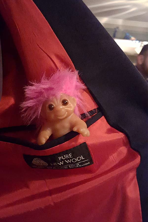 It didn’t take Moonie long to locate his friend Dan Baldwin, who was wearing a black sportcoat with a shiny red inside. “Can I ride in your coat?” Moonie asked, drawn to the shiny redness. So that’s how he spent part of the night.