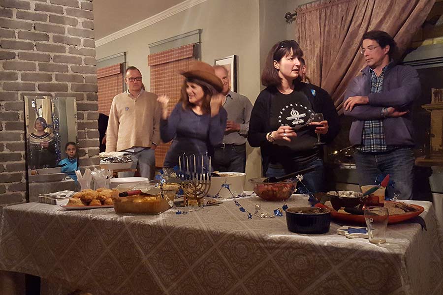 Renee, with Jennifer Jane’s help, paused to explain a bit about Hanukkah and a bit about the various food dishes laid out on the table. Jennifer Jane looks REALLY excited about helping to sing the blessings.