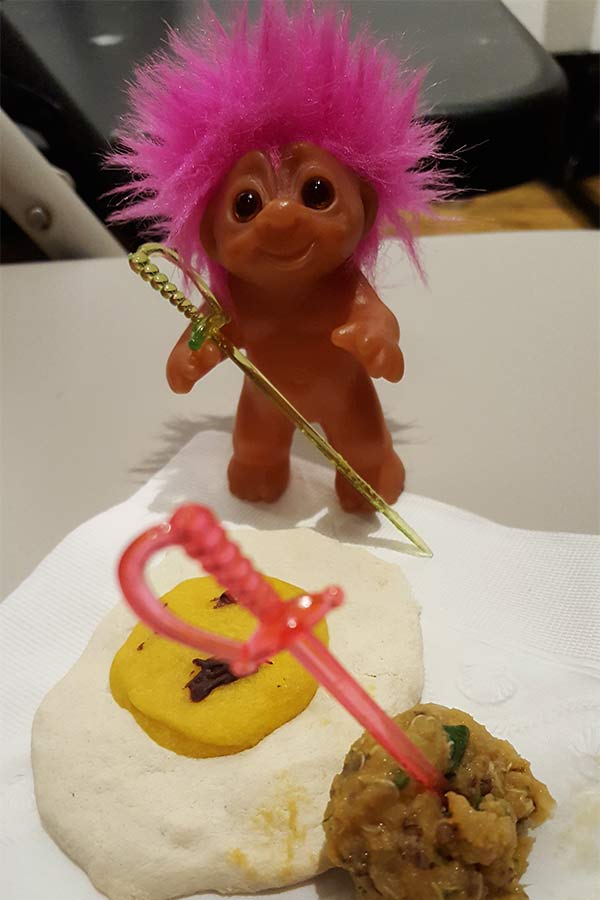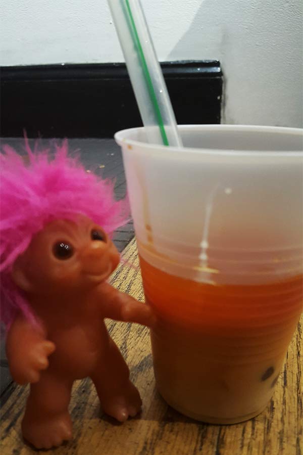 But he’s a lover, not a fighter, and he loved his vegan meatball (made of lentils and herbs) and cookie, following it all with a tasty glass of Jessica’s homemade Thai bubble tea.