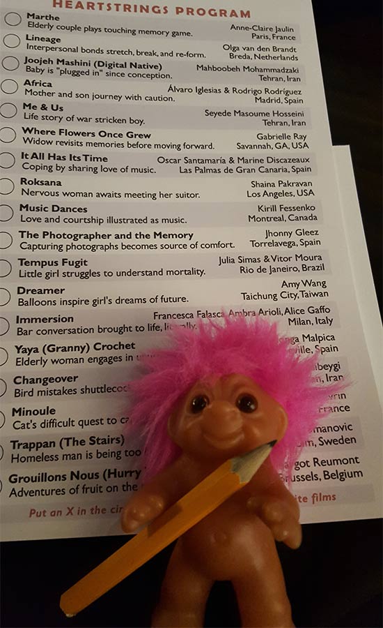 MergingArts attracts filmmakers from all around the world and never charges them a submission fee. The films vary widely but all tell a story in under six minutes. Audience votes are tallied for an audience award, and MergingArts Productions also lines up talented national and international cinematographers, animators, costume and production designers, and composers (the lists of big movies the judges have worked on was dizzyingly impressive!) to serve as judges for juried awards. To make the festival even more magical, MergingArts commissions past festival winners to make the awards for the current winning filmmakers. Such a fun touch!