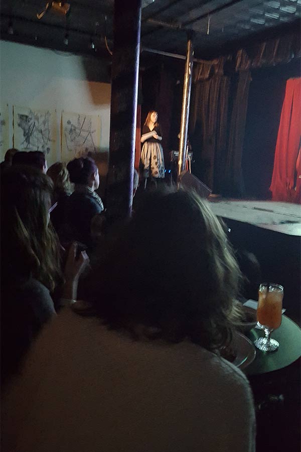 Toni Pennacchia, half of the duo behind MergingArts Productions, regularly DJs on several different regional radio stations and was spinning world and atmospheric music between shows. Here she is introducing the concept of the Short Short Story Film Festival, which is pretty neat.