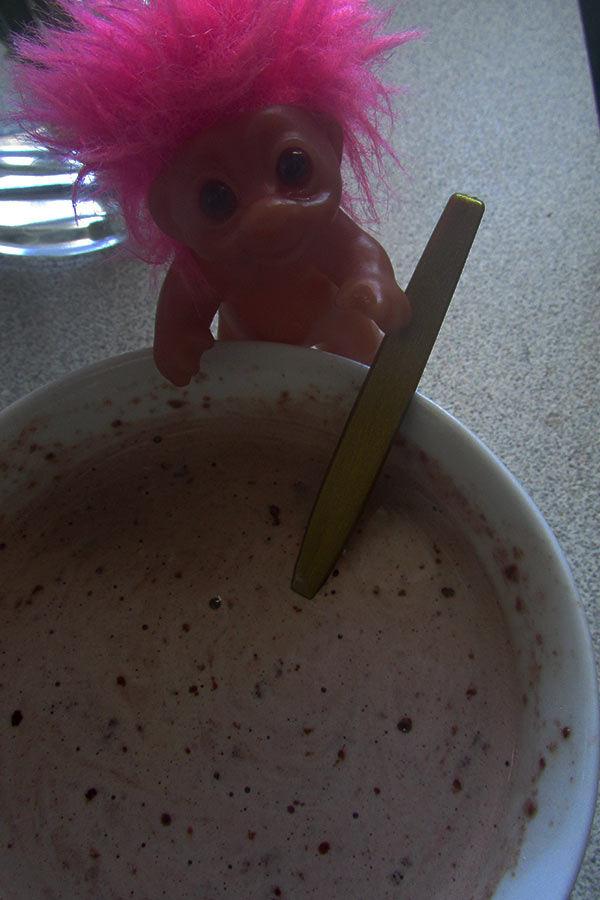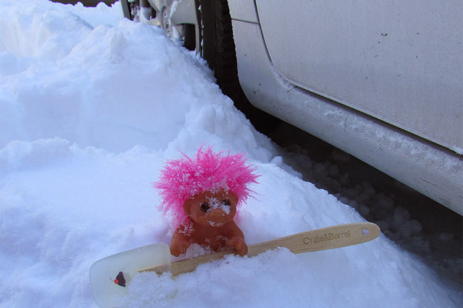 He disappeared, and I thought maybe he went to torture Kitty with some jokes, but when I couldn’t find him in the apartment I peeked outside. He was standing with my snow shovel, holding one of his own – a Moonie-sized spatula, complete with a little cupcake.