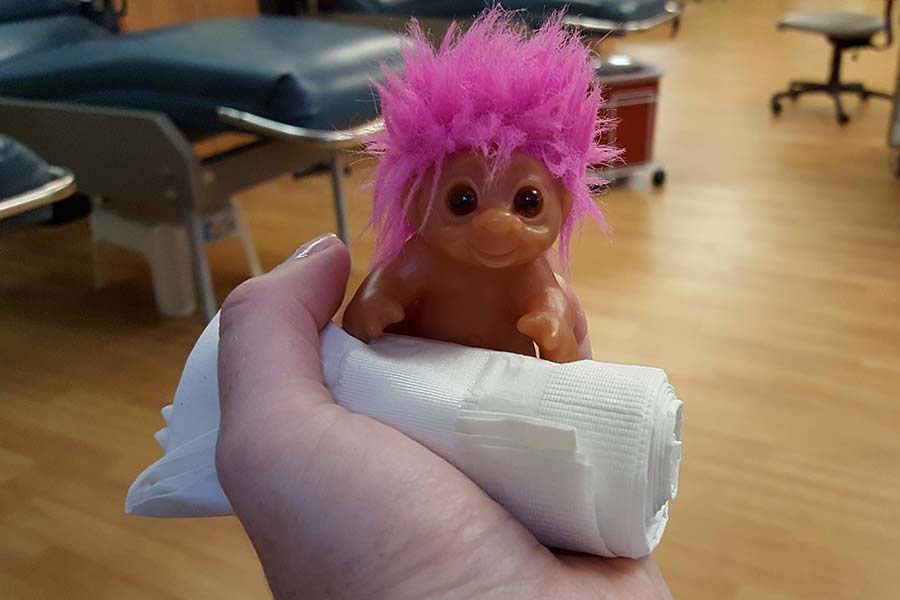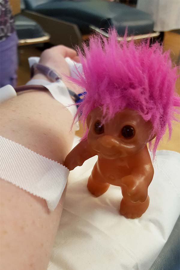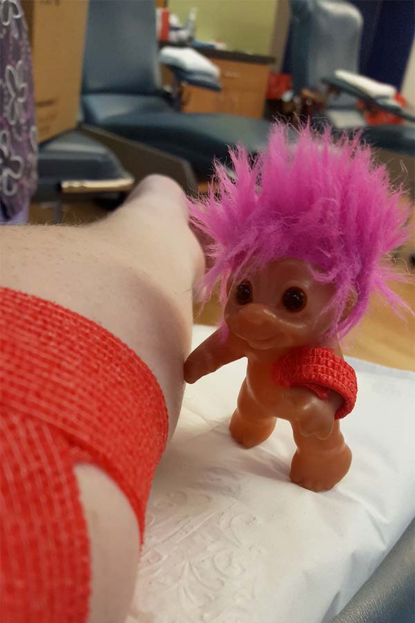 He’s always so quick with his own donation – he donates an itty-bitty thimble full of troll blood – so Moonie always comes right back to coach me through my bigger, longer donation.