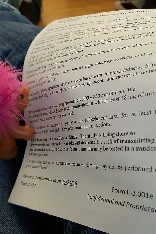 How time flies! Yesterday Moonie grabbed me and said it was time for another appointment to donate at the Rhode Island Blood Center. It’s important to help people who might need our blood, so off we went!