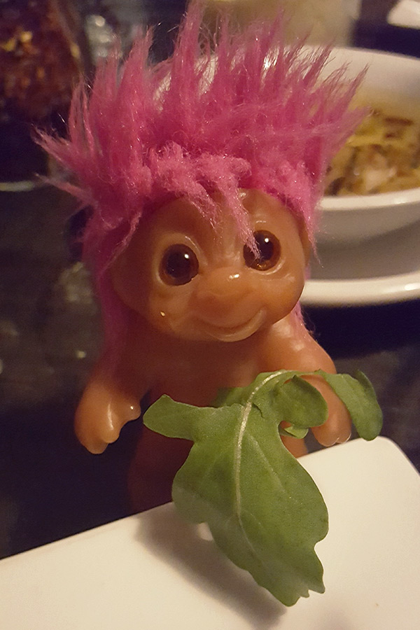 Moonie tried to tell us jokes about greens as he munched on his lots-of-arugula pizza.