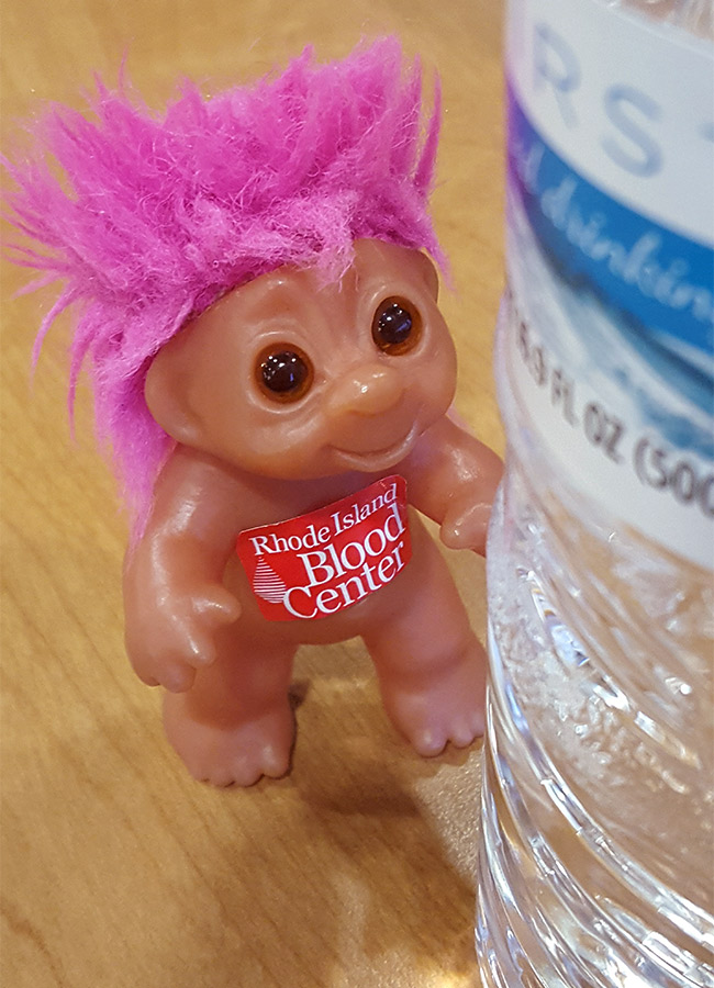 He’s always quick to donate his little thimble of rainbow-colored troll blood, and then he’s usually nice enough to come cheer me on, because he knows I’m not crazy about needles.