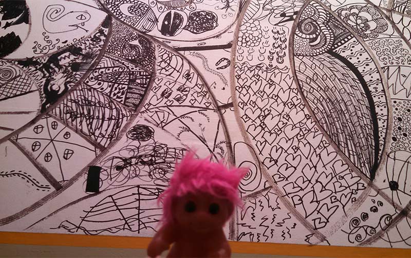 First he checked out one of the drawings that our friend Jen was making, which would be turned into flower art.