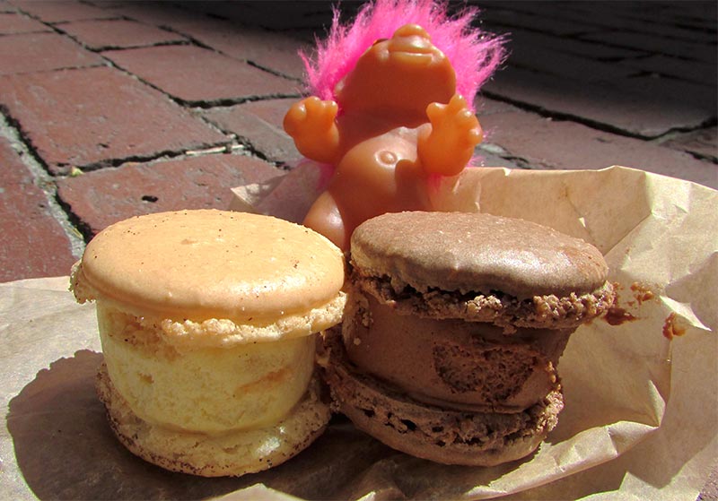 I don’t work nearby anymore, but I’ll stop in for occasional treats and sandwiches. I credit Ellie’s with being the first place to introduce me to frozen macarons (they make non-frozen, “regular” macarons as well). For frozen ones, they start with the little round and often brightly colored meringue-like cookie outsides, but instead of filling them with buttercream or ganache, they fill them with ice cream. This results in the smallest, cutest, and most delicious ice cream sandwiches you’ll ever see, and Ellie’s peddles them from a special little cart on warm days.