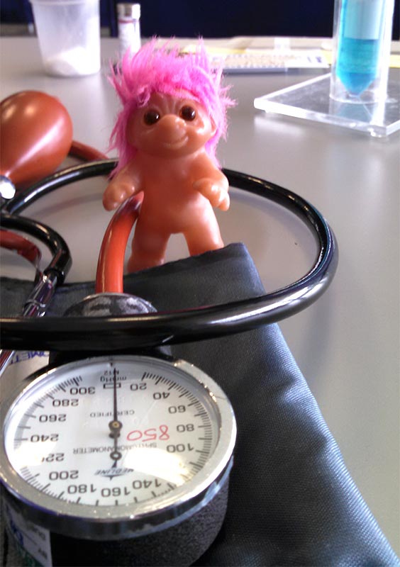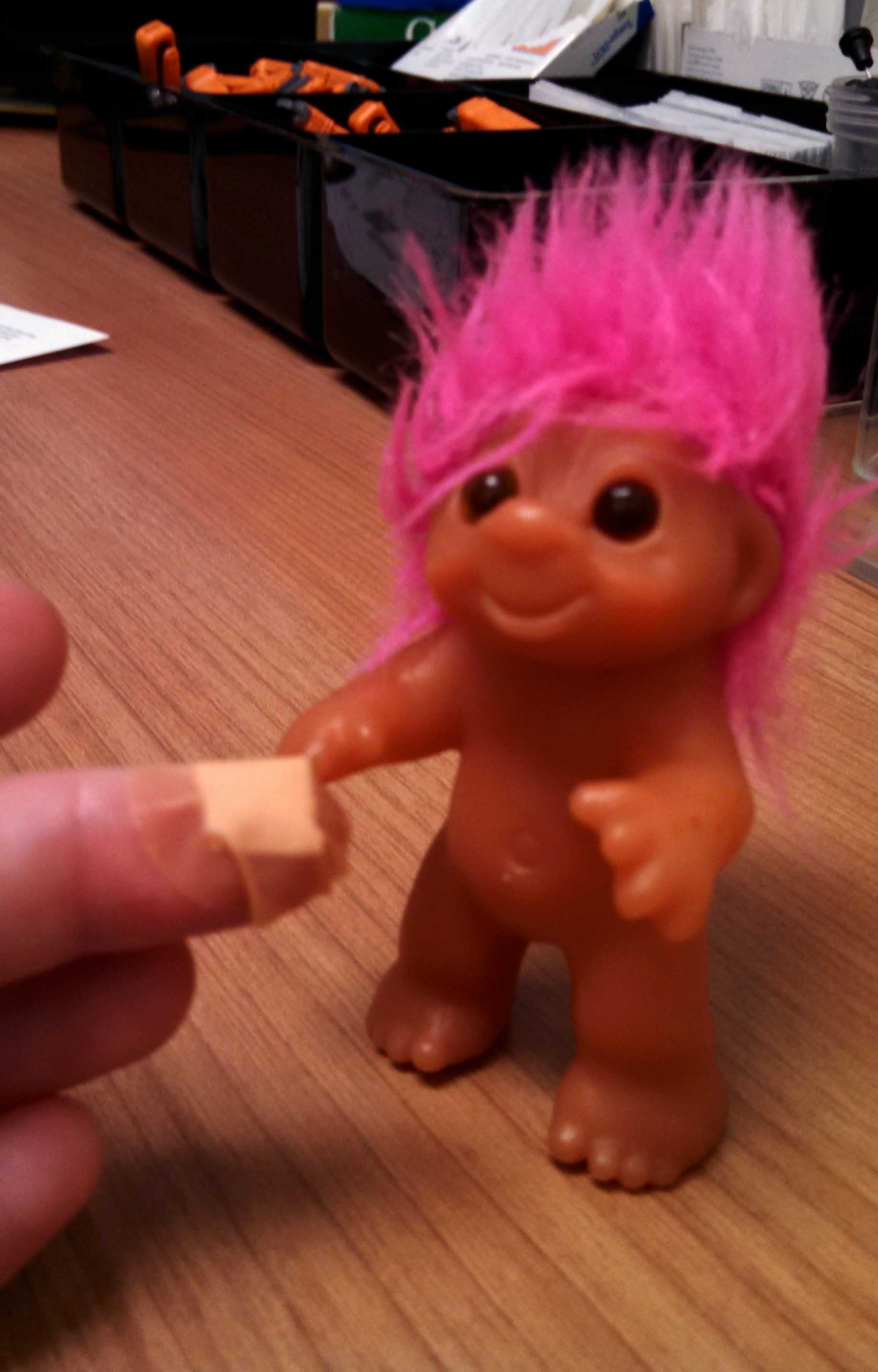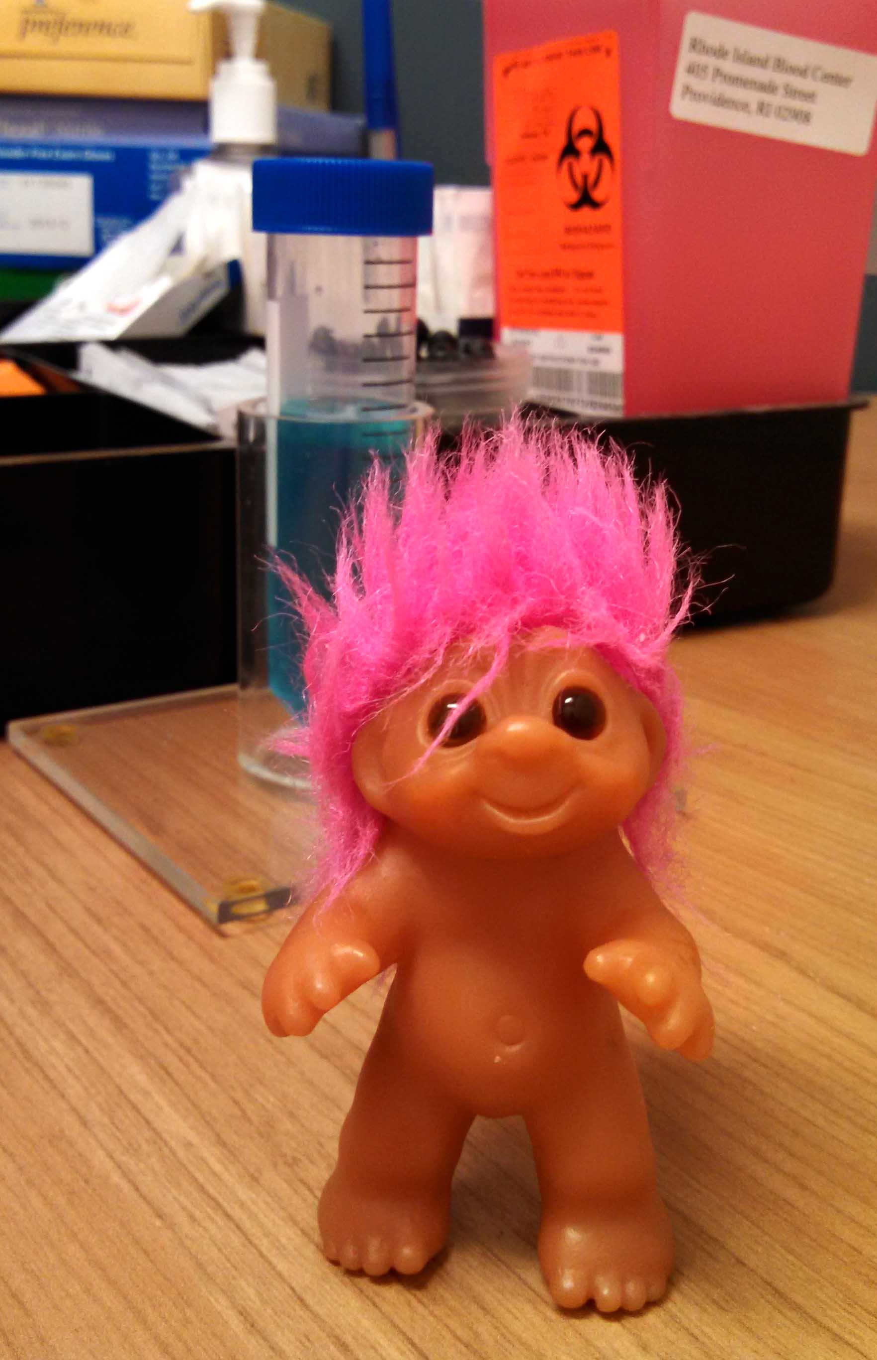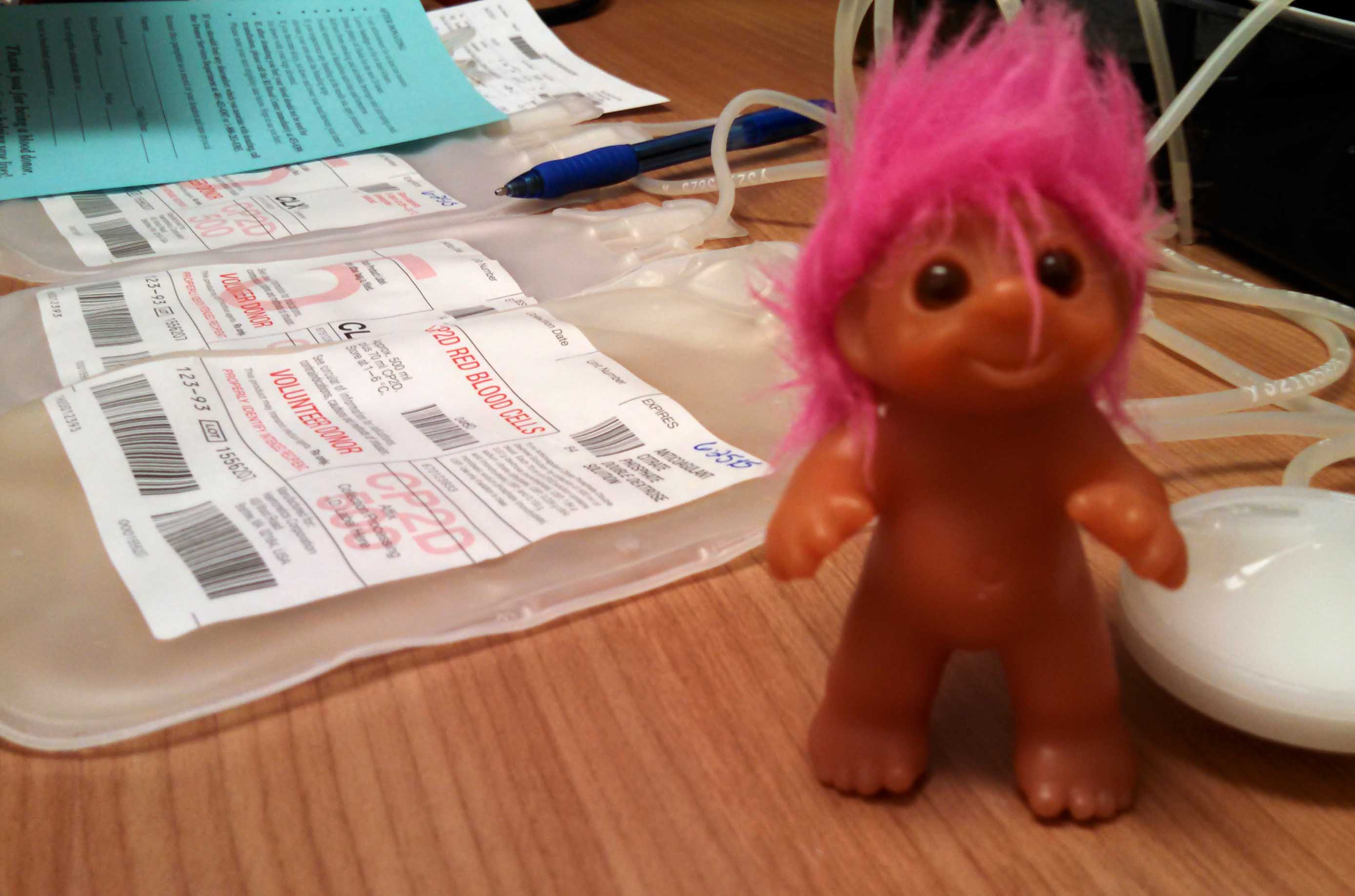 He’s always quick to donate his little thimble of rainbow-colored troll blood, and then he’s usually nice enough to come cheer me on, because he knows I’m not crazy about needles.