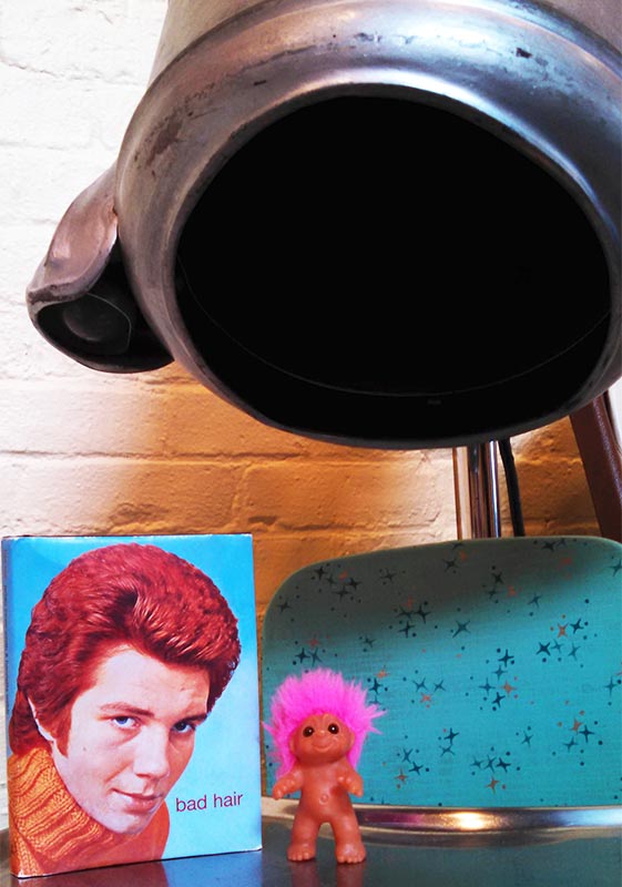 We hadn’t been to Suite Tart since they acquired the property adjoining their tucked-away suite, so right away Moonie ran off to explore the new digs. I found him in the front window, entertaining the lovely hair mannequin (he introduced her as “Lola”) with one of his favorite hair jokes.